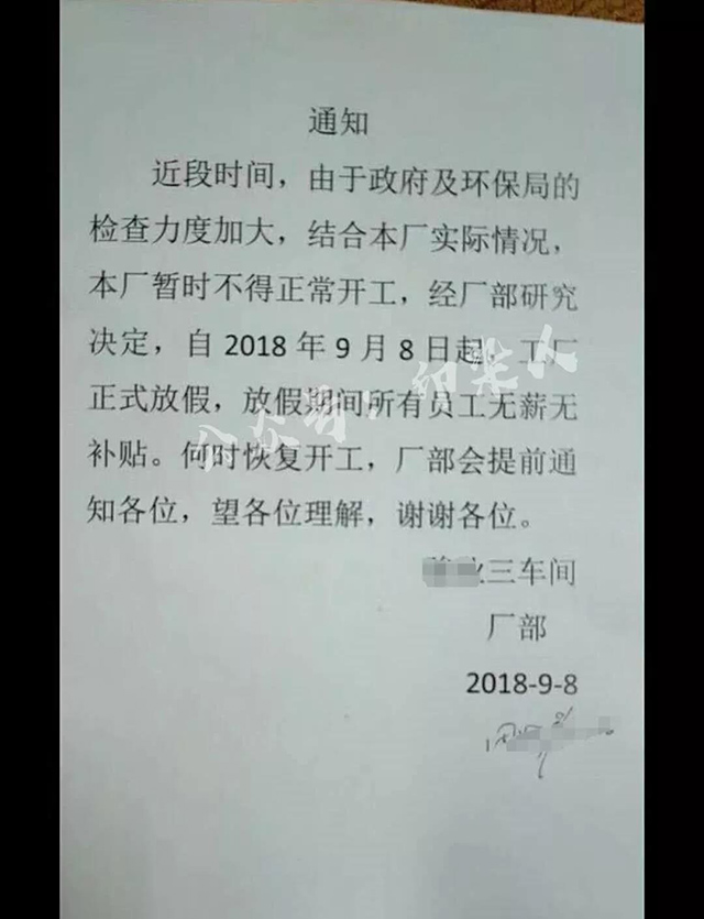 印染厂都已经放假了!江门台山某染厂9月8日发出通知,自2018年9月8日起,工厂正式放假,放假期间所有员工无薪无补贴。何时恢复开工,厂部会提前通知各位。