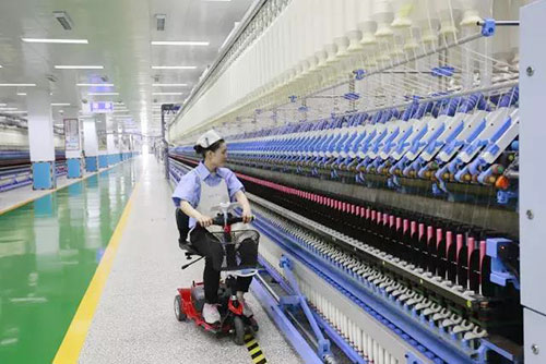 魏桥纺织股份有限公司邹魏三园二纺12.5万纱锭的智能化纺纱工厂,投资3亿元建成投产。该厂可实现“生产全程自动化”、“控制系统智能化”、“在线监测信息化”,工厂的生产情况在厂总控平台可一目了然。细纱值车工坐电动小车在车间巡回。