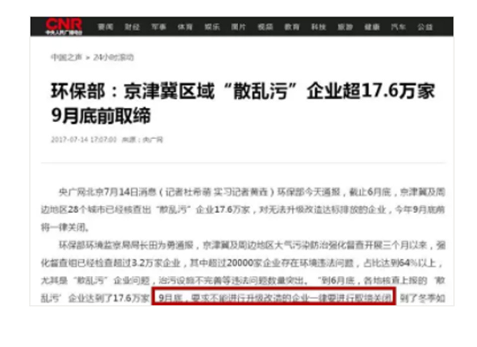 据央广网、上海证券报消息,环保部7月14日通报,截止6月底,京津冀及周边地区28个城市已经核查出“散乱污”企业17.6万家,对无法升级改造达标排放的企业,今年9月底前将一律关闭。