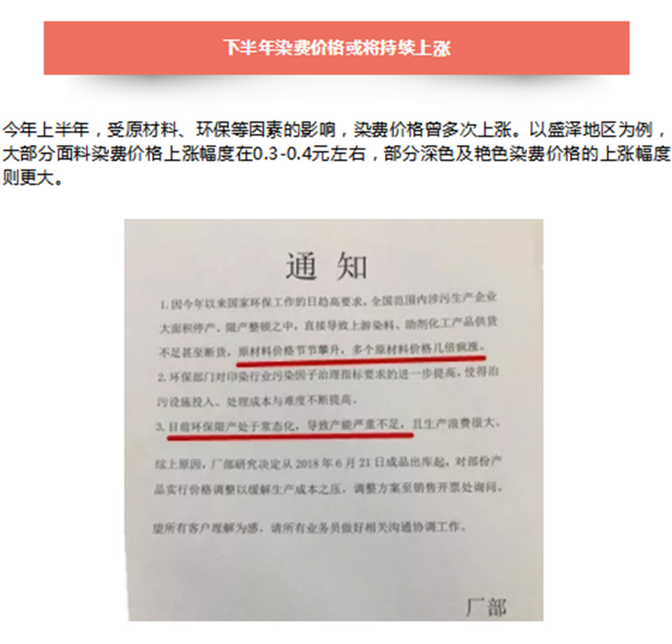 环保部近日通报,对无法升级改造达标排放的企业,今年9月底前一律关闭。国务院安监总局也宣布7-10月开展安全生产大检查,中国34个省市自治区的印染企业均将“被检查”,无一能幸免!此时环保部、安监总局再次大打出手零容忍展开治理工作,业内人士表示2017开年致使的涨价因素不止原材料价格暴涨及涨价潮,其实有十几种因素,目前多个印染、化工产业园被关停整治!有专家表示今年下半年将是印染行业洗牌最残酷的半年,印染行业不止是连续多轮涨价,而是有钱也未必能及时染到布!