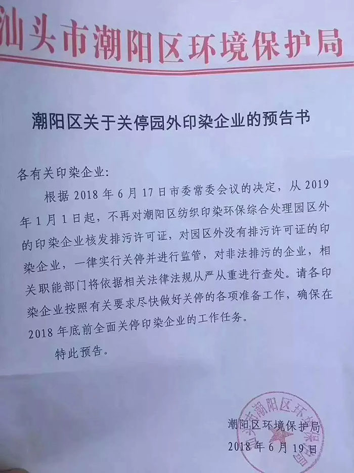 因为很多企业污染太严重,据我了解,汕头那边的印染厂已经关闭了2/3,这边也有1/3的企业印染行业关闭。