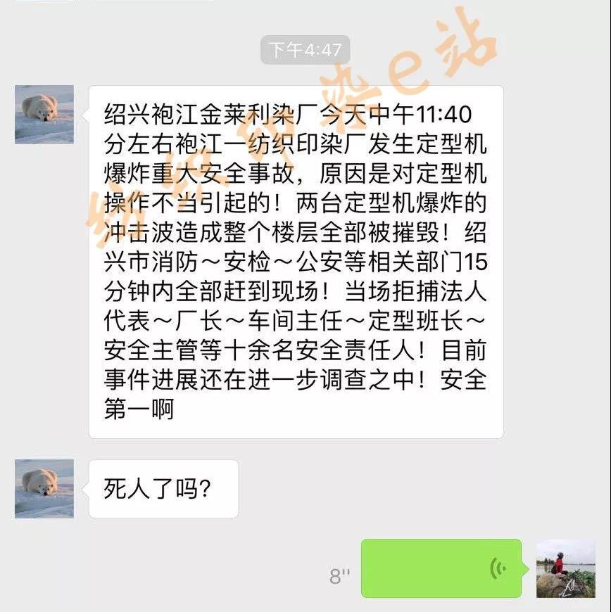 今天中午11:40分左右,绍兴袍江金莱利染厂发生定型机爆炸重大安全事故,原因是对定型机操作不当。