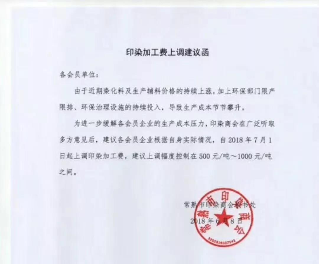 为进一步缓解各会员企业的生产成本压力,印染商会在广泛听取多方意见后,建议各会员企业根据自身实际情况,自2018年7月1日起上调印染加工费,建议上调幅度控制在500元/吨-1000元/吨之间。