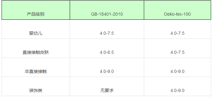 pH值即酸碱度,人体皮肤呈弱酸性,在这种环境条件下可以防止病菌的侵入,因此纺织品的pH值若在微酸或者中性之间就有利于保护人体健康;反之,纺织品pH值过高或过低都会破坏皮肤的平衡和抵抗能力,从而引起皮肤过敏或者诱发感染导致病菌侵入。