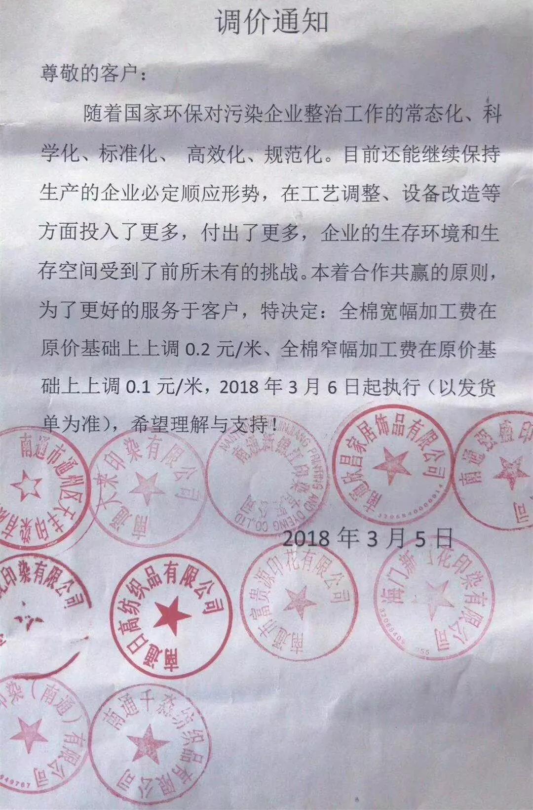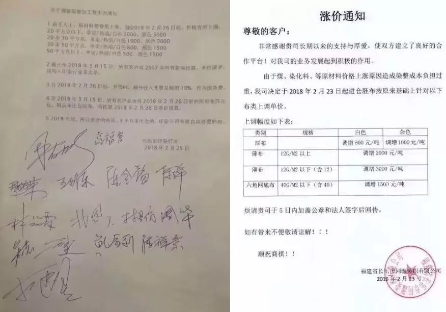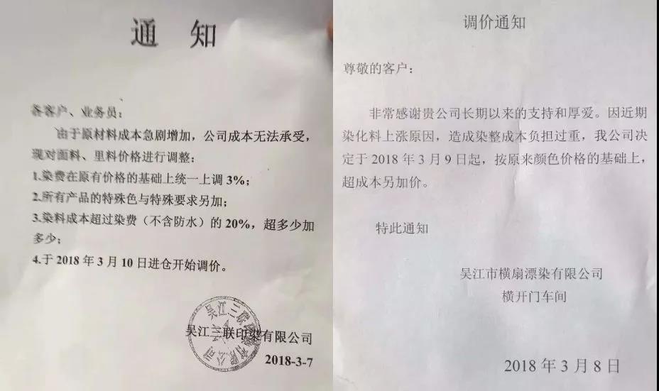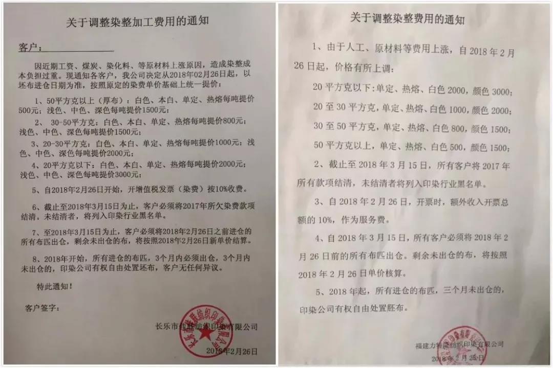 如2018年2月底,福建长乐等地区印染企业打响染费涨价第一炮。调价函称,此次染费上涨的主要是基于近期染料、煤炭、工人工资等成本急剧上升的原因,企业负担过重,不得不涨价。2018年3月初,南通地区11家印染企业统一发布提价函称,企业的生存环境和生产空间受到了前所未有的挑战,并在此节点上上调加工费用。