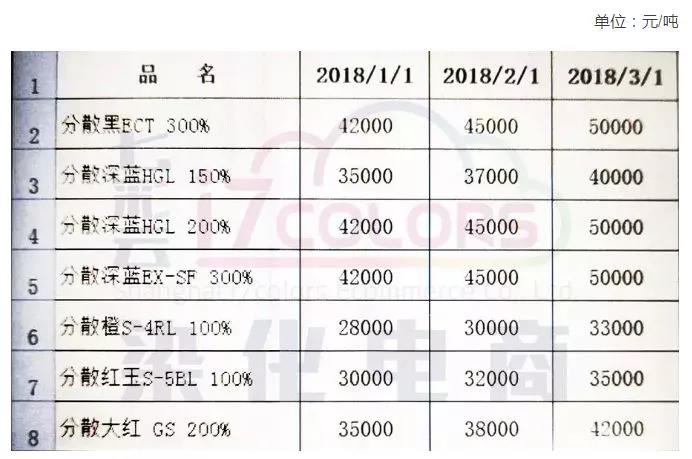 2017年12月28日,分散染料提价。造成本轮涨价的主要原因:前期由于环保等因素,绍兴联发、杭州宇田两家中等规模的分散染料企业已经关停。近期江苏化工企业爆炸事件的发生,导致分散染料及相关中间体价格攀升;同时连云港与盐城地区分散染料生产企业安全监管力度继续加强,部分龙头生产企业已经处于停产状态,导致染料供应缺口已经形成。