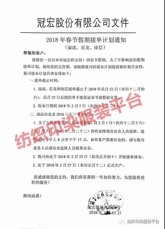 距离春节越来越近了,各行各业都在为年假加班加点,印染企业放假时间也基本敲定了。看着过去的2017年和形势依旧严峻的2018年,真是喜忧参半。喜的是新年到来,忧的是来年的生意。