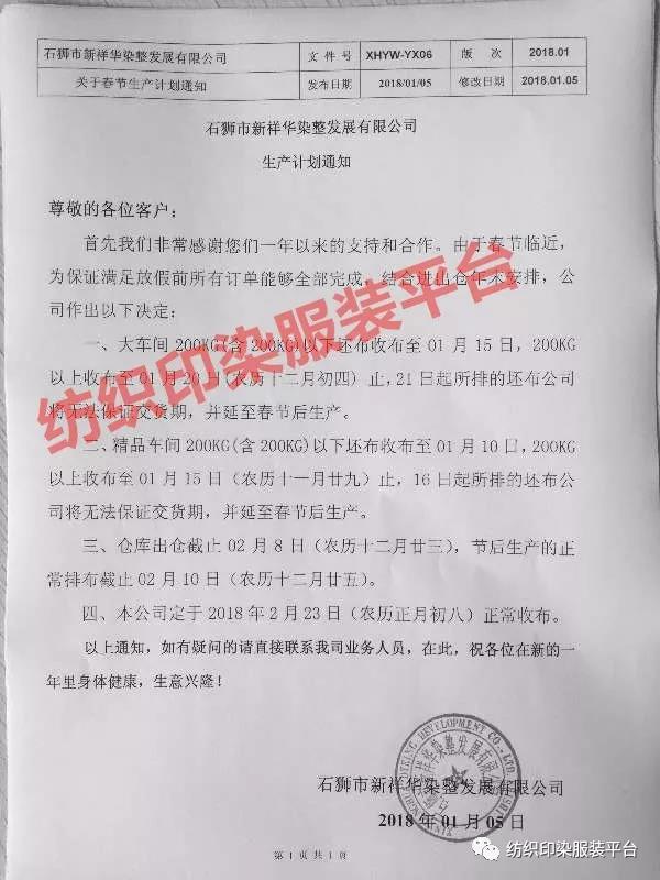 1月15日:停止收坯(200KG以下);1月26日:停止收坯(200KG以上);1月21日所排的坯布将无法保证交货期