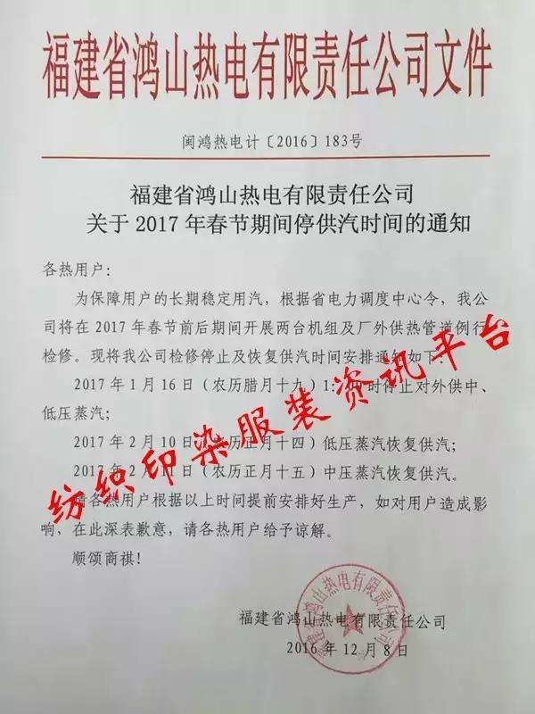 石狮鸿山热电厂停汽时间公布,意味着石狮印染行业放假时间基本确定,因石狮印染行业已经基本上都用热电厂的中低压蒸汽。