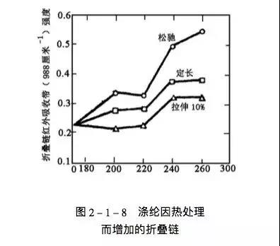 热定型时,张力不同也会对纤维结构产生一定的影响,有人将高度拉伸的涤纶,在三种(松弛、维持定长、拉伸10%)不同的张力条件下,进行高温处理后,测定了波数为988厘-1的吸收峰的强度,如图2-1-8所示。从图中可看出: