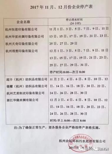 紧急通知:8家纺织印染厂(见下图名单),自11月1日起至12月30日止,分单日(1、3、5、7、9...)和双日(2、4、6、8、10...)每天轮流停产24小时!每家印染厂共计停产30天和31天!