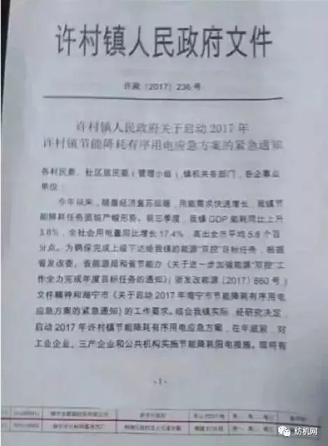 纺织重镇许村镇也发出两张限电通知:自11月16日起至12月底,规下企业每星期三、四、五停电24小时,即"开四停三"。