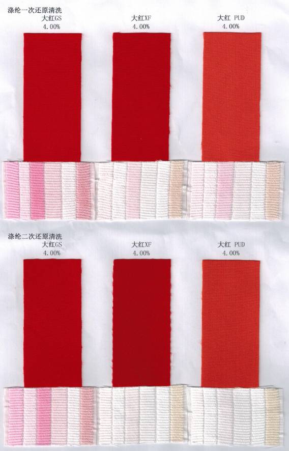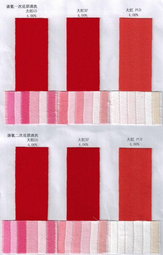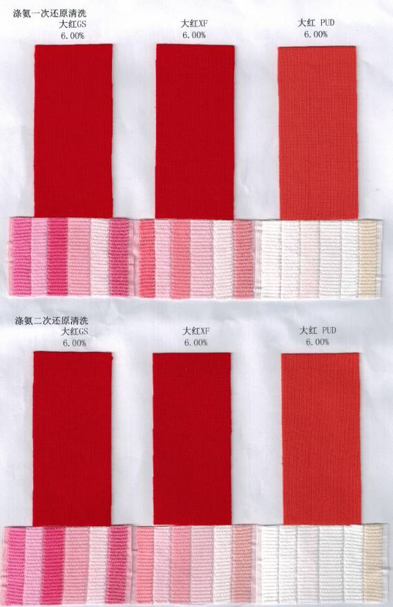 再是我们纯涤纶上面经常所有的大红XF,这个大红在纯涤纶的水洗牢度表现还是可以的,而且经济性好,但是在涤氨纶上表现就会很差。那就要选择最新的大红PUD,这个大红在纯涤纶和涤氨纶上面都表现出良好的性能。
