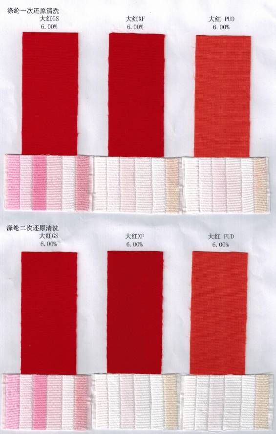 下图列举了三个大红在4.0%和6.0%深度,纯涤纶和涤氨纶,一遍碱性还原清洗和两遍酸碱还原清洗的效果图很直观的表现除了几个大红之间性能以及一遍还原清洗和两遍还原清洗之间的水洗牢度的差距。