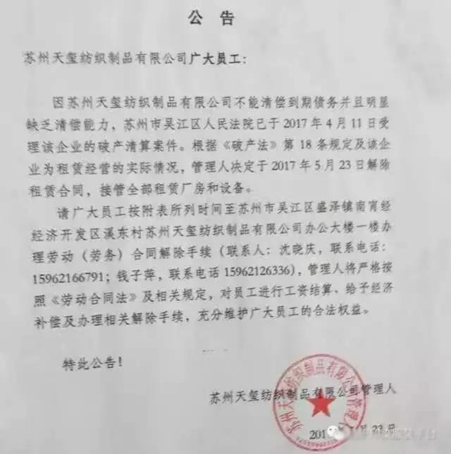 破产公告:因苏州天玺纺织纺织制品有限公司不能清偿到期债务并且明显缺乏清偿能力,苏州吴江人民法院已于2017年4月11日受理该企业的破产清算案件。