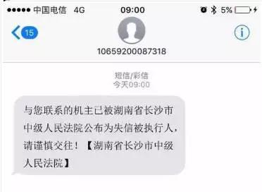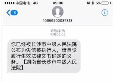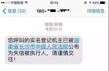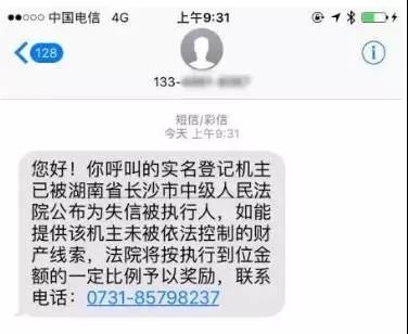 法院对被列入失信被执行人名单的机主统一发送短信: