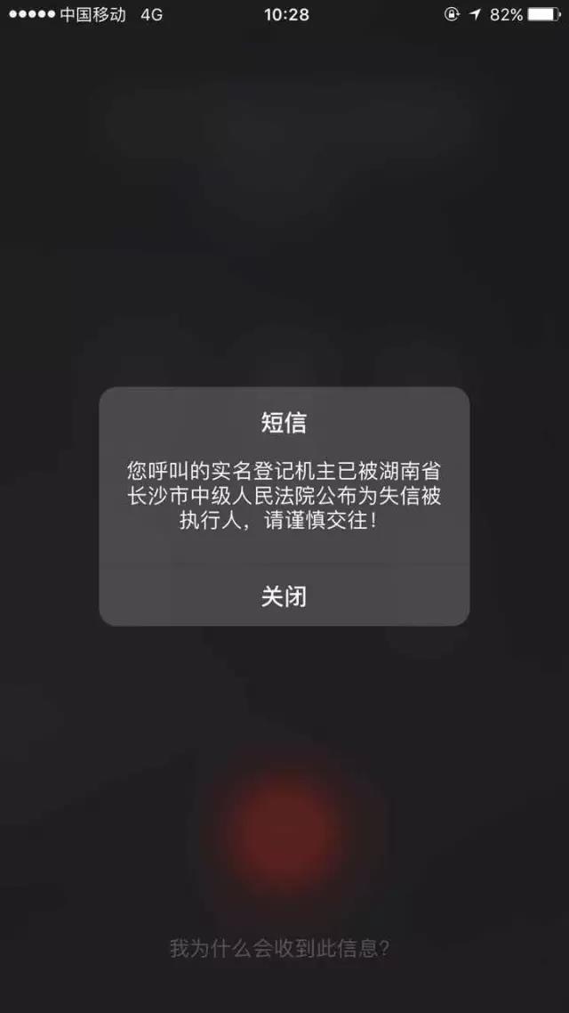 “你呼叫的实名登记机主已被湖南省长沙市中级人民法院公布为失信被执行人,请督促其尽快履行生效法律文书确定的义务”;
