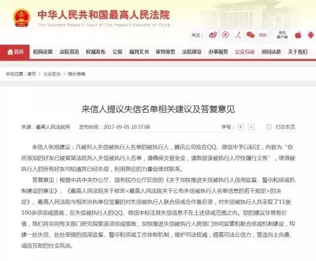 9月5日,最高法在回信中答复称,对失信被执行人共采取了11类100余项惩戒措施,在失信被执行人的QQ、微信中标注其失信信息不在上述惩戒范围之内。您的建议非常有价值,我们将会同有关部门研究探索该项惩戒措施,加快推进失信被执行人跨部门协同监管和联合惩戒机制建设,构建一处失信、处处受限的信用监督、警示和惩戒工作体制机制,维护司法权威,提高司法公信力,营造向上向善、诚信互助的社会风尚。