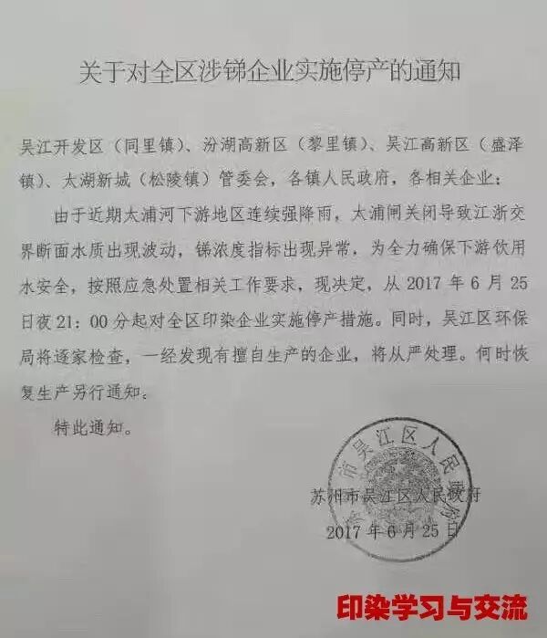 突发│吴江环保局紧急通知:所有印染企业“全部停产”!染费上涨一触即发!