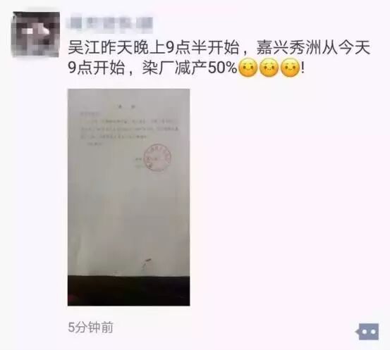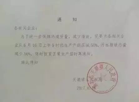 就在吴江地区印染企业经历第一次限停产的时候,16日上午9点开始,嘉兴秀洲的染厂也被要求:产能压减50%,污水排放总量减少50%,何时恢复正常生产届时再通知!话不多说,直接上图: