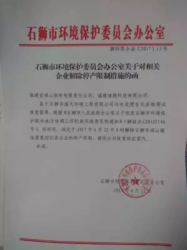 鉴于石狮市海天环境工程有限公司污水处理系统调试恢复需要,根据《石狮市人民政府办公室关于印发石狮市环境保护联合执法协调工作机制实施意见的通知》(狮政办[2012]146号),经研究,决定于2017年6月22日8时解除石狮市鸿山镇伍堡集控区各企业的停产限制,请你公司恢复供应蒸汽。