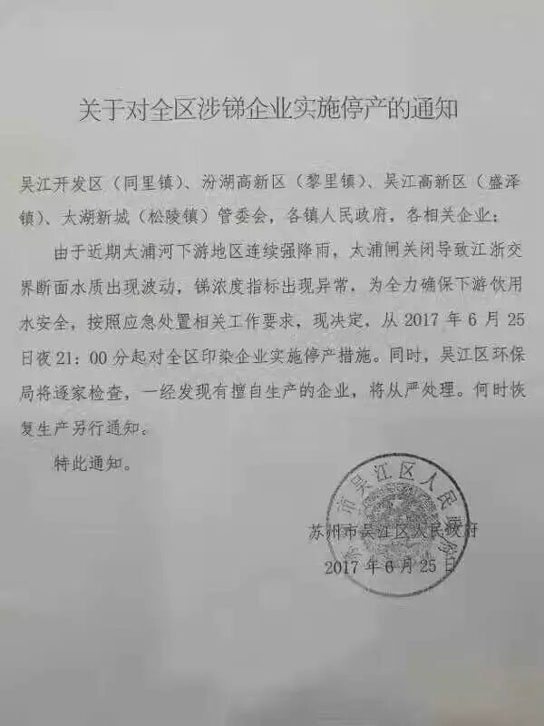 6月15-16日,环保局紧急通知,要求盛泽所有染厂开一半停一半,行业内一时激起千层浪,好在17日晚,各印染厂已经恢复生产。可刚刚消停了10来天,区政府再度紧急通知,因断面锑指标已超警戒标准,全区印染企业从25日晚9点起全部停产。污水厂26日起关闭阀门!