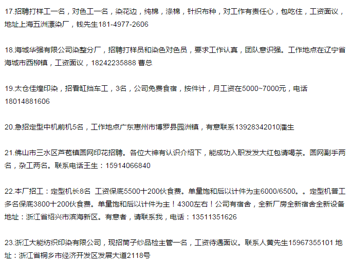 招聘丨染色主管-对色-化验室领班-电工-调色-跟单-印花