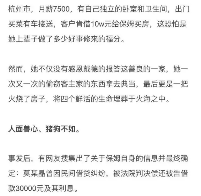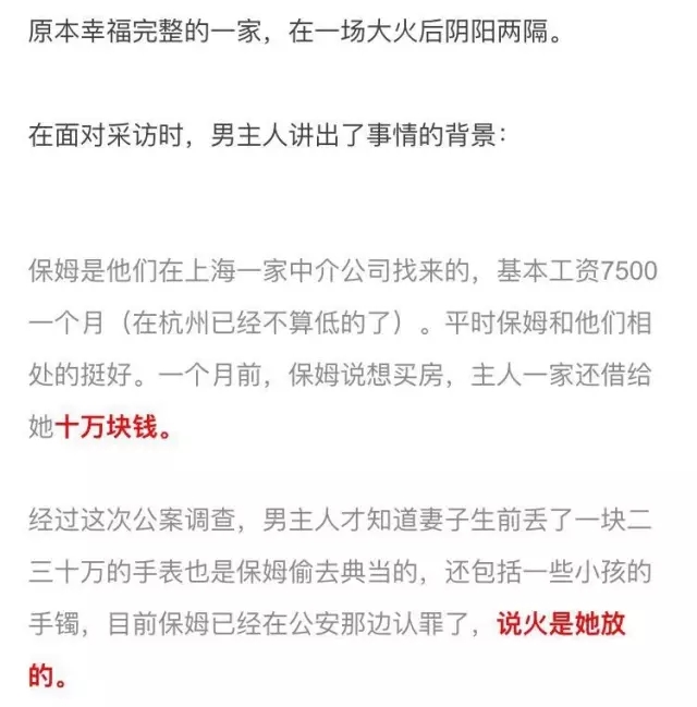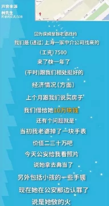 事件发生后,保姆在独自逃出火海时还佯装镇定的配合着警方的调查。