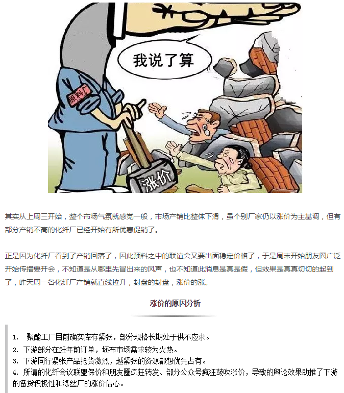 核心提示:昨天周一,依然又是无休止的充斥着化纤联谊会联合涨价的“噱头”,又或是各种PTA涨,还是原油涨还是MEG涨,总之各种能尽之的炒作理由都被化纤厂翻遍了,搞得下游甚至都找不到任何可以不进原料的理由。