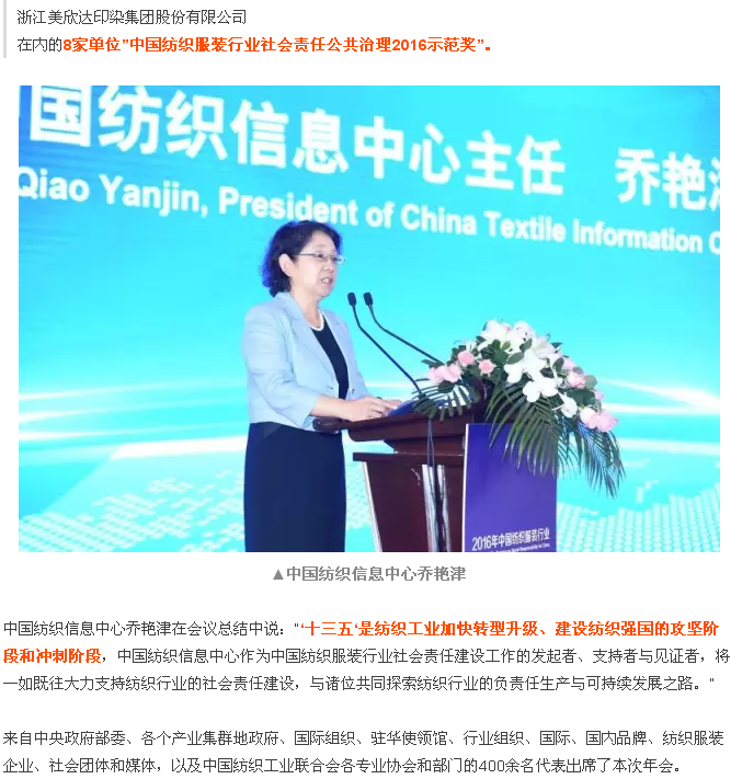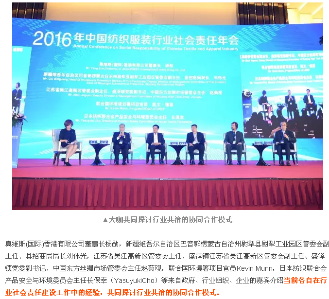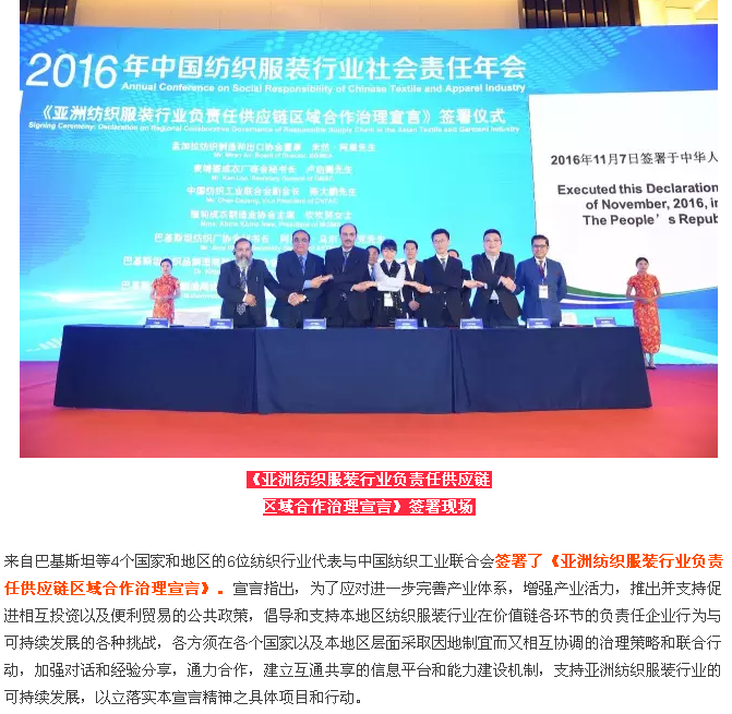 陈大鹏还在会议上阐述了纺织行业最新的12个社会责任发展目标,包括体面劳动、社会对话、性别平等、青年发展、绿色制造、环境友好、可持续创新、负责任供应链、负责任投资、负责任消费、尊重产权和诚信竞争。他说:“这是我们面对联合国可持续发展可持续发展目标和实现国家建设生态文明和全面建成小康社会的产业解决方案。”