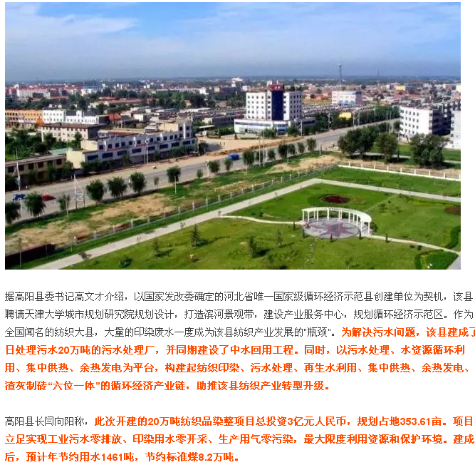 闫向阳透露,该县投资4亿多元建设的集中供热锅炉项目,将把污水处理厂处理的中水转化成蒸汽通过供热管网供至各印染企业,污水处理厂产生的污泥将制成泥饼为供热锅炉提供燃料,余热用于供暖和发电。项目全部建成后,可拆除燃煤专业锅炉和分散采暖炉92台,年节约标煤1万吨,减排烟尘500吨。 闫向阳表示,今年上半年,高阳县域民营经济营业收入增速居河北省首位,综合位次居全省第29位,较上年前移81位。当日,投资12亿元的宏润城市广城项目、投资2.3亿元的物流园区项目一期及投资亿元的宏利佳学校项目一期同期开建。(完)