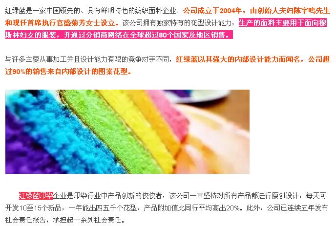 核心提示:获悉,10月18日,英联投资,一家全球领先的新兴市场投资基金,宣布将投资于中国领先的纺织面料企业浙江红绿蓝纺织印染有限公司(“红绿蓝”)。