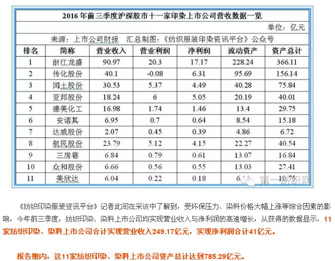 导读:《纺织印染服装资讯平台》10月29日专稿:据该公众号记者不完全统计,截止10月28日早间,沪深两市11家纺织印染、染料上市公司陆续发布2016年三季度业绩公告。