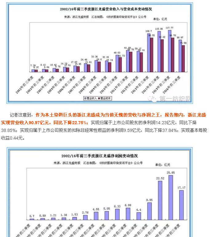 本土染料及染料中间体上市公司闰土股份,2016年1-9月份实现营业收入30.53亿元,与去年同期相比下降10.29%,实现营业利润5.37亿元,与去年同期相比下降32.24%,实现利润总额5.46亿元,与去年同期相比下降35.36%,归属于母公司股东的净利润4.41亿元,与去年同期相比下降35.18%。