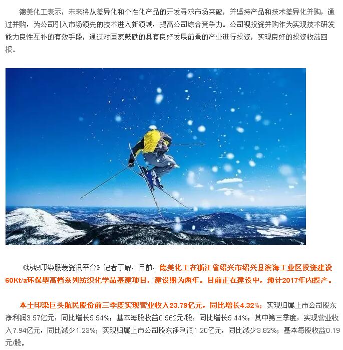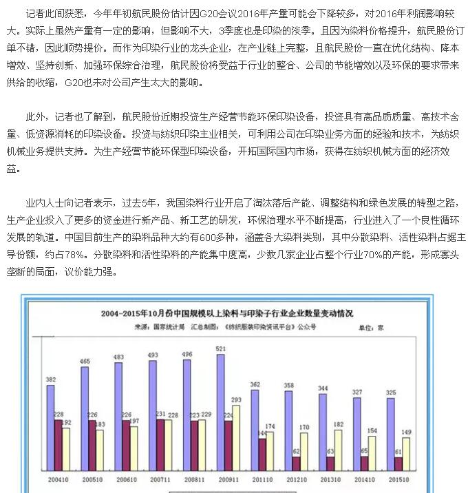 总体来看,在印染的成本构成中,染料占印染成本比重低,约10%左右,因此下游印染企业对染料提价的接受能力较强。今年以来,绍兴地区启动对印染产业的重点整顿,加快推动印染产业从中低端向中高端转型,因此大量中小印染企业的停产,导致市场需求格局发生变化,印染订单向大型企业集中,使得大型企业开始满负荷运转,染料需求开始转旺,在成本推动+环保驱动+下游接受度提升+旺季来临,染料有望迎来新一轮景气行情,包括闰土股份、浙江龙盛、安诺其等上市公司在内的动向,也值得业界人士为之高度关注。