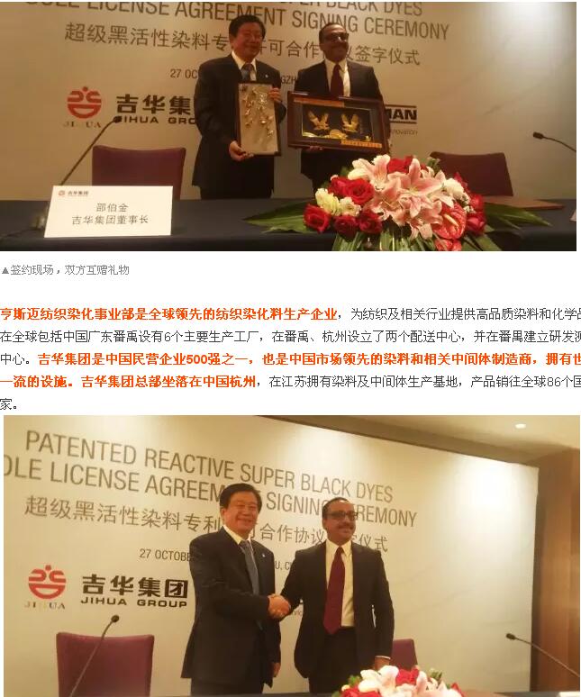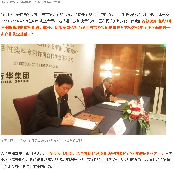 核心提示:中国杭州,2016年10月27日——亨斯迈纺织染化事业部 (NYSE:HUN) 今日与浙江吉华集团签署战略合作协议。根据此协议,双方将在一系列广泛的领域开展合作,以满足中国纺织行业对于染料化学品解决方案持续增长的需求。这一合作也将促进提高双方的供应链效率,以更快地满足客户的需求,并帮助他们提升成本效益。