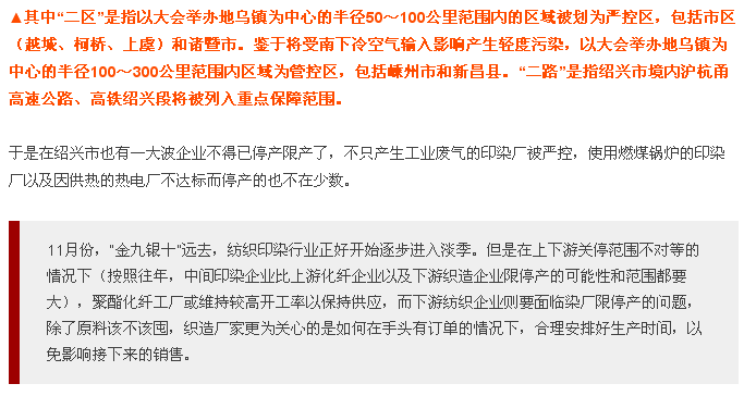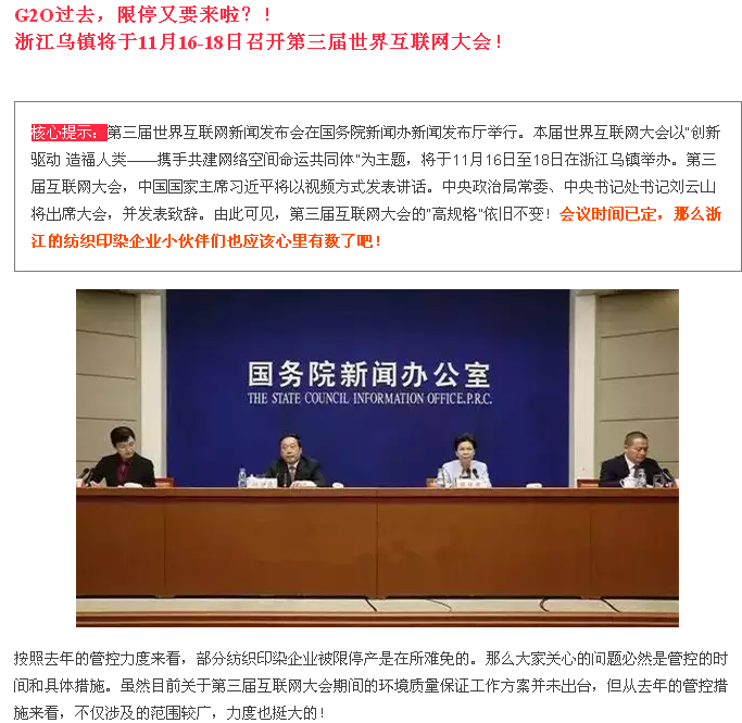 友情提醒: 如果说今年11月16-18日的第三届互联网大会按照去年的标准和范围对相关地区实施管控,那么周边纺织印染企业的小伙伴们要提前做好准备啦!
