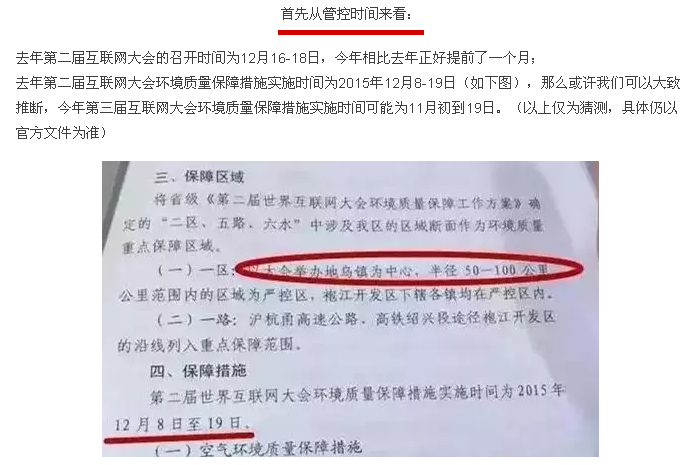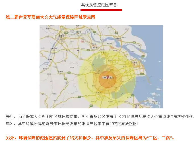 如果说今年11月16-18日的第三届互联网大会按照去年的标准和范围对相关地区实施管控,那么周边纺织印染企业的小伙伴们要提前做好准备啦!
