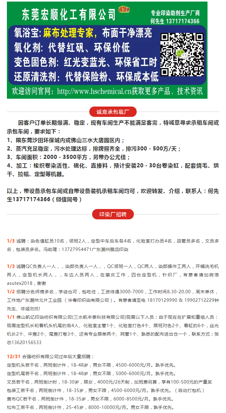 印染招聘专刊丨承租染厂车间,华粤印织染、金丰染整