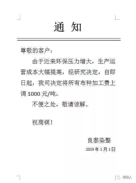 2019年才刚刚开个头,印染行业染费呈爆发趋势,预计春节过后,生产旺季来临,随着染化助剂用量增多,印染企业成本将近一步提高,一股染费上涨大风必将刮来。