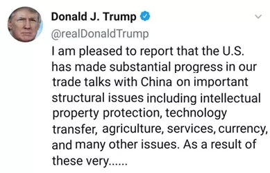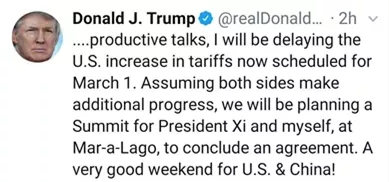 2月24日下午,美国总统特朗普在其推特账户上宣布,将推迟3月1日上调中国输美商品关税的计划。