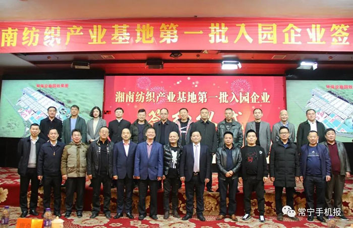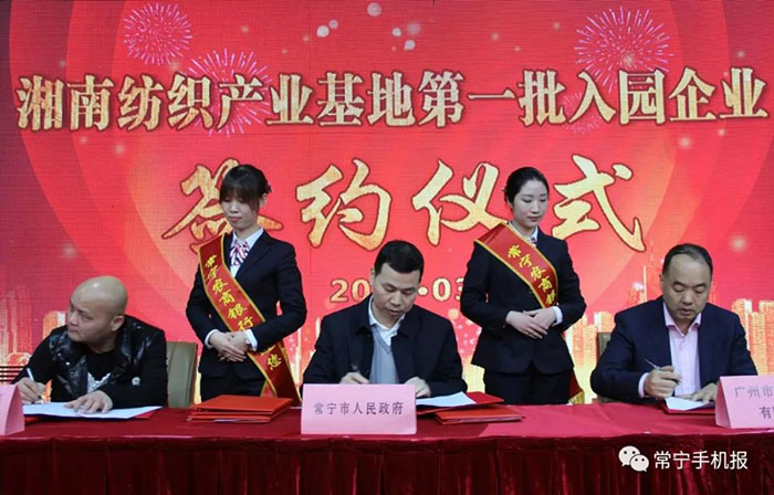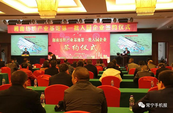 3月8日,湘南纺织产业基地第一批入园企业签约仪式在常宁帝煌大酒店举行,16家企业签订入园协议,成为湘南纺织产业基地的第一批“主人”。