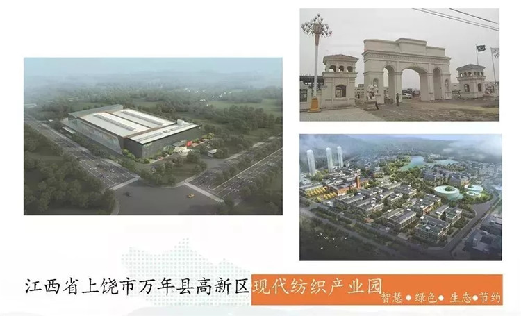 万年绿色现代纺织产业园规划面积1600亩,总投资40亿元,由苏美达吉杰欧公司、万年县政府及世界绿色设计组织纺织专业委员会合作共建。该园集专业生产、印染加工、技术研发、产品检测、展览营销、人才培训、物流配送为一体,着力打造国内外纺织产业优化升级、辐射扩散、梯度转移和纵深发展的平台。该项目建成后将有序承接重大纺织企业,实现年产值100亿元。