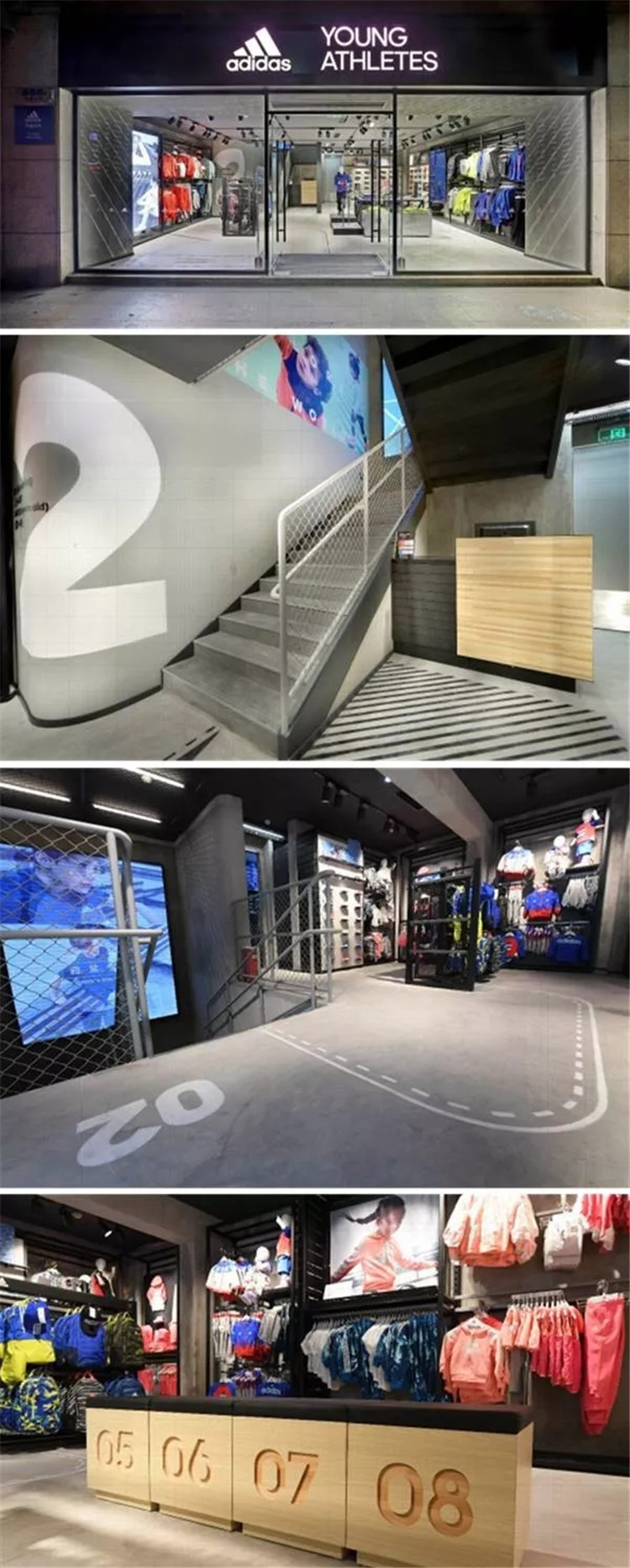 门店整体被打造为一个体育场,店内的扶梯设计成了运动场上的围栏网,地面特设运动场风格的引导线,希望为小朋友提供一种动感、真实的运动购物体验。售卖的商品儿童年龄跨度较大,既包括小月龄婴儿的休闲鞋,也涉及15、16岁青少年的运动鞋与运动服。