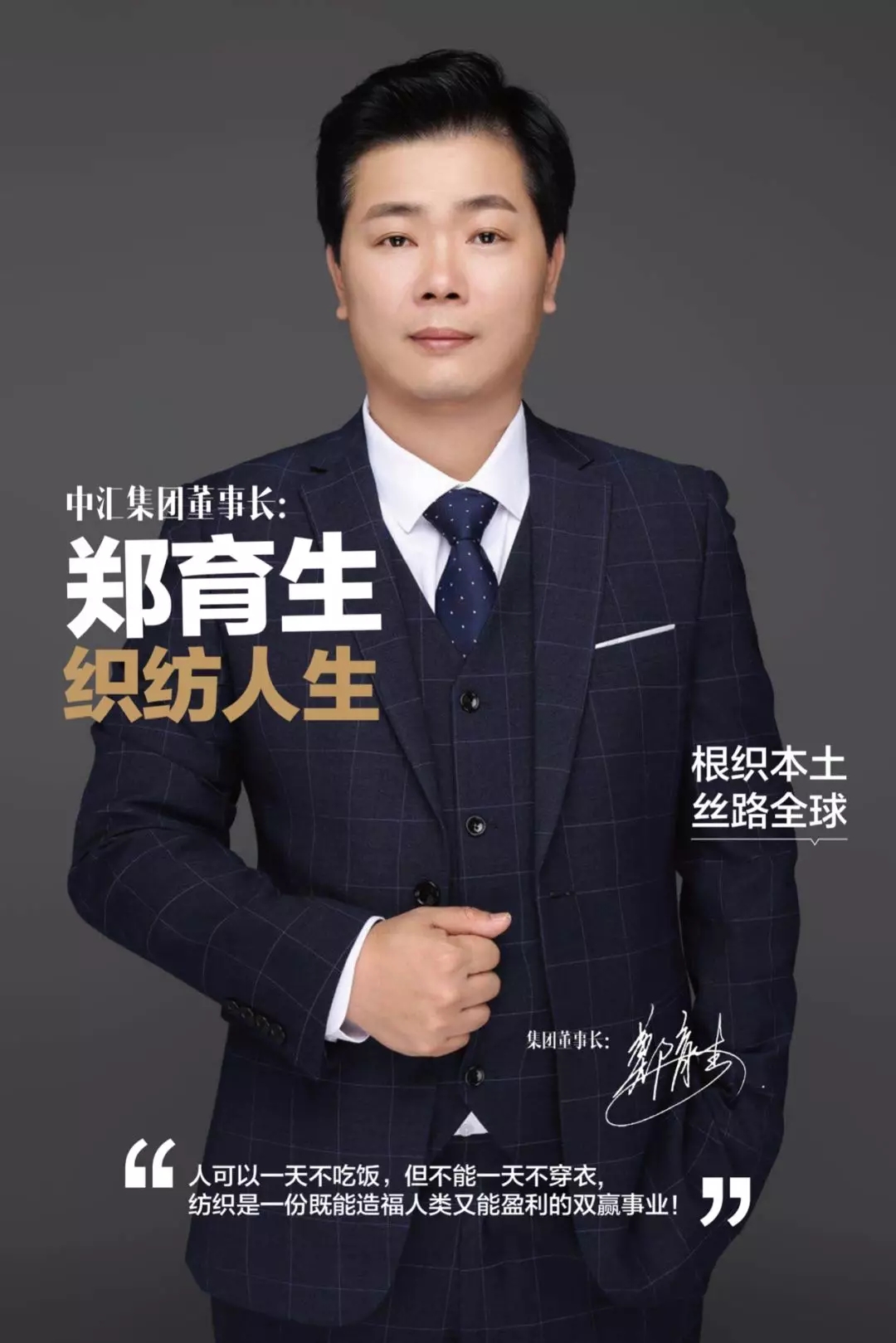 郑育生先生秉着“人才为本,科技领先,客户至上。”的经营理念,专业、专注、专一,力求使中汇成为国际面料行业中的航空母舰。在坚守传统面料行业中创新模式,插上资本的翅膀,追求卓越、成就中汇集团美好未来。