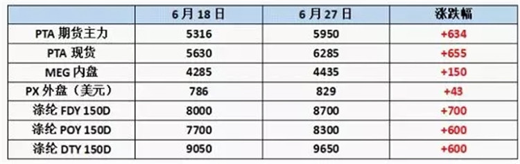 价格方面,在巨大利好的带动下,近两周以来,聚酯原料的价格,无论是PTA、乙二醇、PX还是涤纶长丝均开始大幅上涨。
