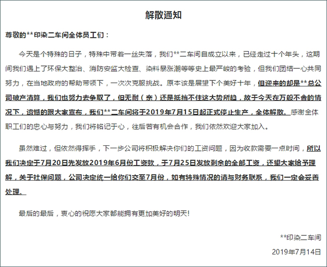 2019年7月14日,印染重地浙江,一个叫**印染二车间的公司,满怀悲情的发出一份解散通知,令人唏嘘。