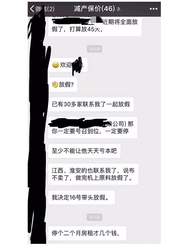 无独有偶,在这位布老板跟小编聊天之后的几天,朋友圈也传出了织造厂家准备抱团限产保价的消息: