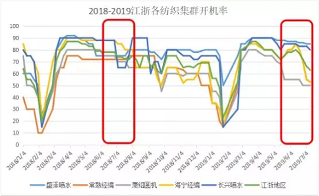 据悉,苏北、中西部地区纺织企业的库存普遍在2个月左右,进入7月开机率就有下降,维持在7-8成,其中个别厂家已经开始“放暑假”;江浙地区主要集群开机率也有所下降,现喷水织机开机率在8成左右;经编开机率在5成偏上;圆机开机率降至5成左右,与上月相比,开工负荷环比下降了17个百分点,厂家生产积极性明显受挫。