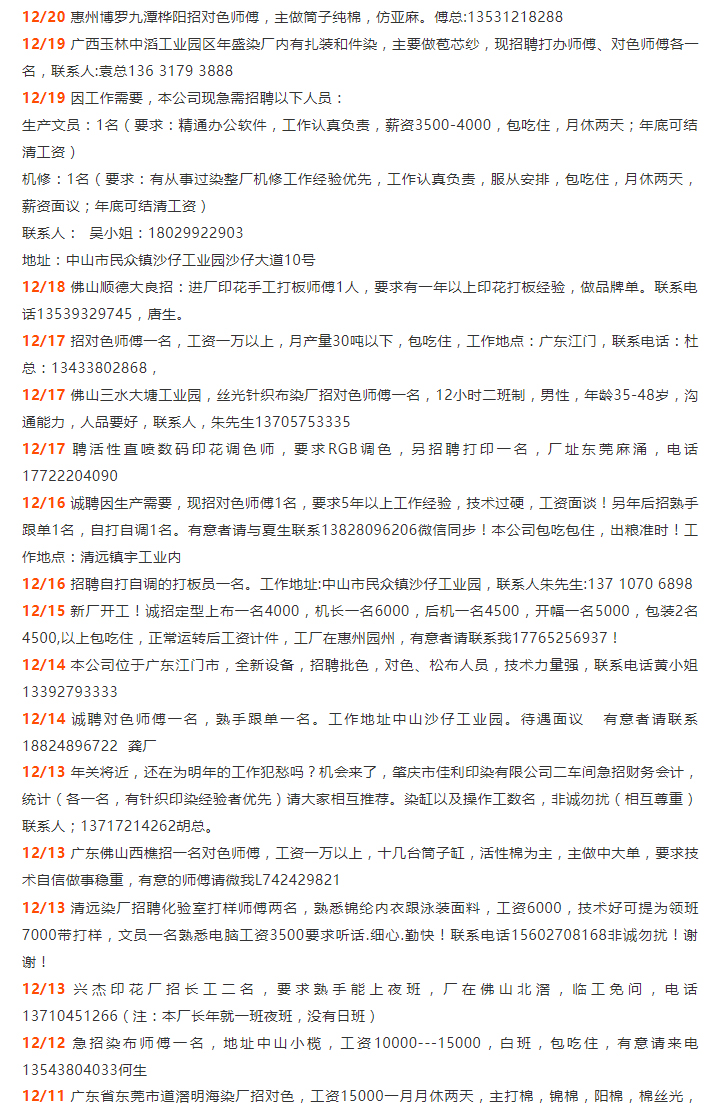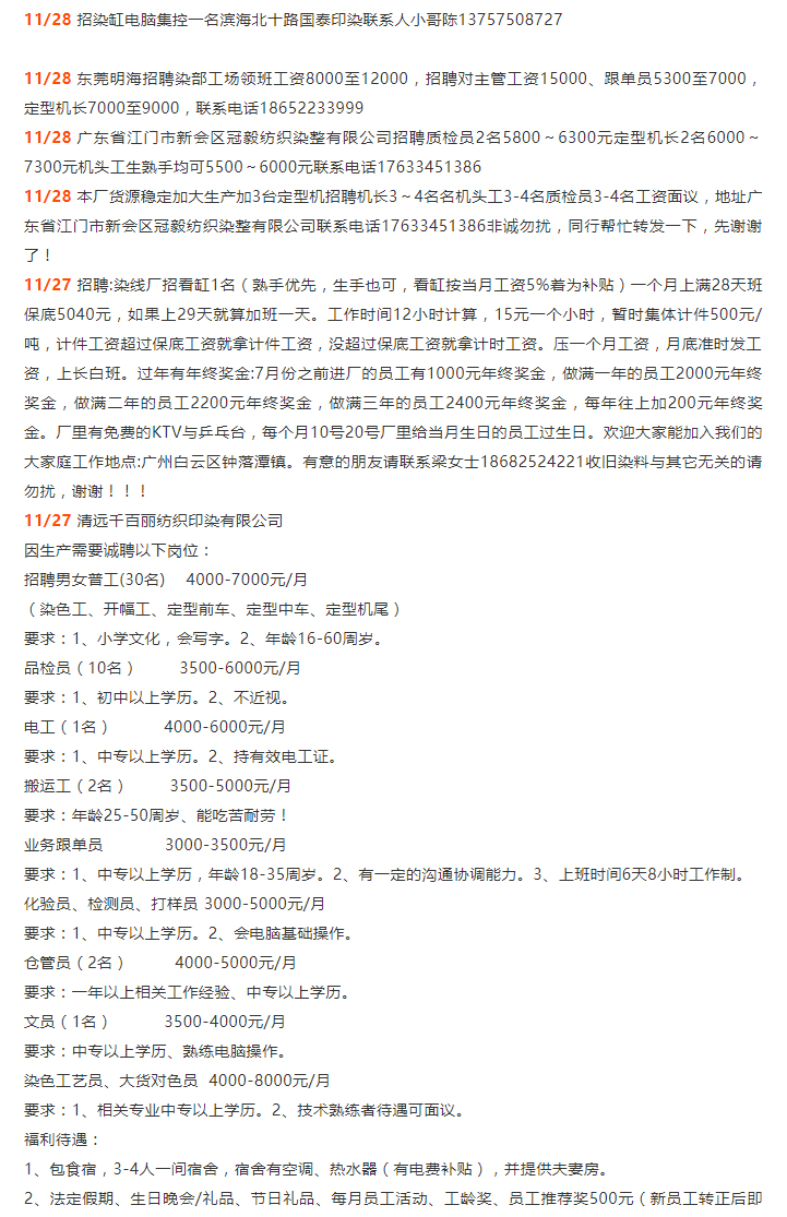 印染招聘专刊丨承租染厂车间,华粤印织染、金丰染整